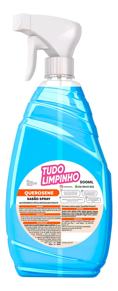 Sabão de querosene em formato spray, com solução líquida azul indicada para limpeza pesada, apropriado para uso em pisos e áreas que necessitam de remoção de gordura e sujeira mais resistente. Produto pronto para uso, dispensando diluição.